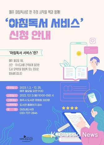 K-Classic News 박미영 기자 | 미리내도서관(관장 이선화)은 내년 1월부터 매주 한 주의 시작을 책과 함께하는 독서모닝콜 '아침독서' 서비스를 운영한다고 밝혔다.