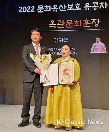 K-Classic News 박미영 기자 | 부산시(시장 박형준)는 부산시 지정 제11호 무형문화재 구덕망깨소리 보유자인 김귀엽 (사)부산광역시 무형문화재연합회 이사장이 지난 8일 한국문화재재단 ‘민속극장 풍류’에서 대한민국 옥관문화훈장을 수훈했다고 전했다.