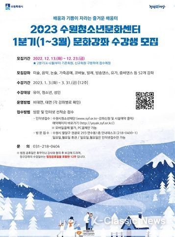 K-Classic News 최태문 기자 | 수원시청소년재단 청소년문화센터는 12월 13일부터 23일까지 2023년 1분기(1~3월) 문화강좌 수강생을 모집한다.