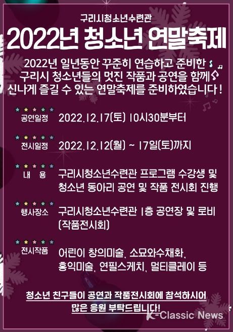 K-Classic News 최태문 기자 | 구리시청소년재단 구리시청소년수련관은 오는 12월 17일 오전 10시 30분부터 수련관 공연장에서 올 한해 청소년활동을 마무리하고, 2023년을 준비하고자 “2022 구리시청소년수련관 연말축제”운영할 예정이다.