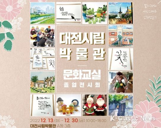 K-Classic News 박미영 기자 | 대전시립박물관은 문화예술교육사업으로 진행한 문화교실 수강생들의 성과발표 작품전시회를 오는 12월 13일부터 30일까지 박물관 3층(로비)에서 개최한다고 밝혔다