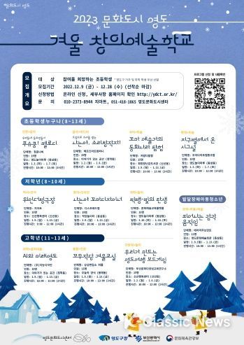 K-Classic News 박미영 기자 | 영도문화도시센터에서(센터장 고윤정)는 '2023년 문화도시 영도 겨울 창의예술학교'를 영도 곳곳에 위치한 지역 내 거점문화공간에서 펼친다. 이번 창의예술학교는 3년째 운영하는 창의예술 프로그램으로 영도구 8~13세 초등학생을 우선으로 선발하며, 영도문화도시센터 홈페이지를 통해 12월 9일부터 12월 28일까지 모집을 진행한다.