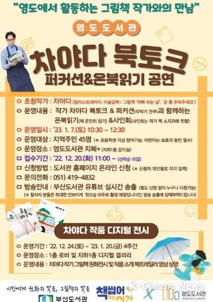 K-Classic News 최태문 기자 | 영도도서관(관장 이미경)은 부산도서관 지원사업‘시민에게 원화의 맛을, 그림책의 맛을 : 책 씹어먹는 시간’에 선정되어 오는 1월 7일 토요일 오전 10시 30분 부산 지역 그림책 작가 초청 북토크를 추진한다.