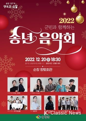 K-Classic News 박미영 기자 | 순창군이 주관하는 문화가 있는 날 ‘군민과 함께하는 2022년 송년음악회’가 오는 20일 저녁 6시 30분 향토회관에서 개최된다.