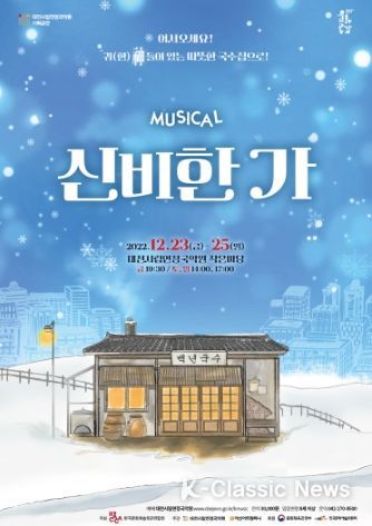K-Classic News 박미영 기자 | 대전시립연정국악원이 크리스마스 시즌을 맞이하여 기획한 세상에서 가장 따뜻하고 유쾌한 창작 뮤지컬 '신비한 가(家)'를 대전 대표 극단인 아신아트컴퍼니와 공동주최로 12월 23일부터 12월 25일까지 국악원 작은마당에서 개최한다.