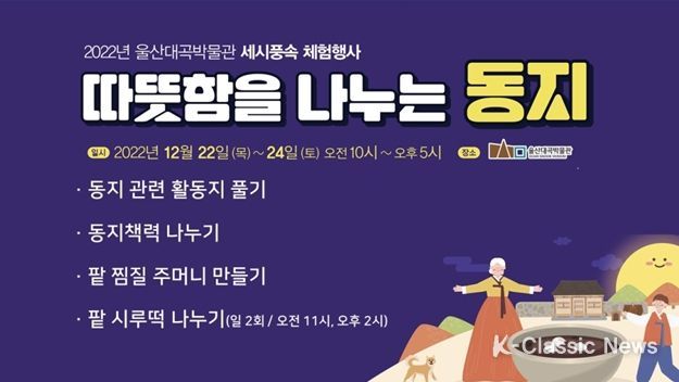 K-Classic News 박미영 기자 | 울산대곡박물관은 동지를 맞아 12월 22일부터 12월 24일까지 3일간 2022년 동지 세시풍속 체험행사 ‘따뜻함을 나누는 동지’를 마련한다고 밝혔다.