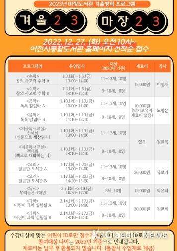 K-Classic News 박미영 기자 | 이천시립마장도서관은 다가오는 2023년 겨울방학을 맞이하여 다양한 주제로 함께하는 ‘겨울23 마장23’ 프로그램을 운영한다고 밝혔다.