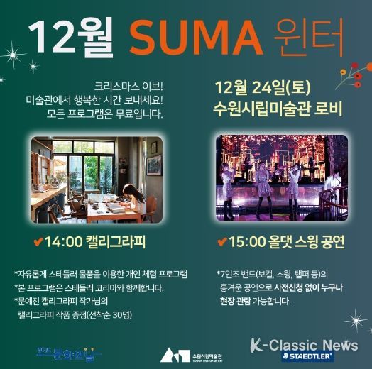 K-Classic News 최태문 기자 | 수원시립미술관은 경기도 문화의 날과 연말을 맞아 시민들에게 다양한 문화 체험 기회를 위한 'SUMA 뮤지엄데이 윈터 페스티벌'을 12월 24일 오후 2시 수원시립미술관 로비에서 개최한다.