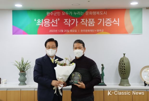 K-Classic News 박미영 기자 | (재)완주문화재단(이사장 유희태)이 2022 ‘전문예술창작지원’을 받아 제작된 최용선 작가의 작품 중 복합문화지구 누에 잔디마당에 야외 설치한 대형조각 1점을 기증받는다.
