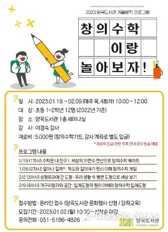 K-Classic News 박미영 기자 | 김포시 양곡도서관은 올 겨울방학에 맞춰 1월 19일부터 2월 9일까지 매주 목요일 오전 10시 양곡도서관 1층 세미나실에서 특별프로그램 ‘창의수학이랑 놀아보자!’를 운영한다고 22일 밝혔다.