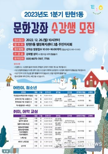 K-Classic News 박미영 기자 | 고양특례시 탄현1동 주민자치회(회장 조경순)는 2023년 1분기(1월~3월) 주민자치센터 문화강좌 신규 수강생을 모집할 계획이라고 밝혔다.