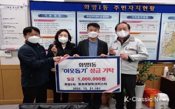K-Classic News 김성연 기자 | 부산 북구 화명1동 행정복지센터는 화명1동 동원로얄듀크비스타 입주민일동가 연말을 맞아 지난 21일 이웃돕기 성금 100만원을 기탁했다고 밝혔다.