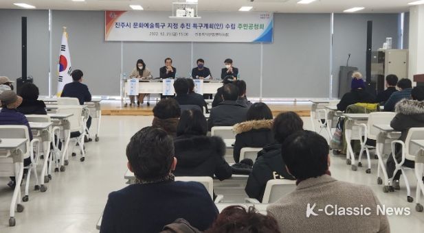 K-Classic News 박미영 기자 | 진주시는 23일 진주지식산업센터 6층 대회의실에서 각 분야 전문가와 시민 50여 명이 참석한 가운데 진주성과 천전동 일원의 진주 문화예술특구 계획 수립을 위한 공청회를 개최했다.