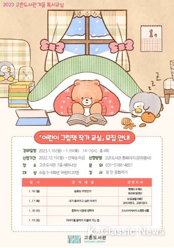 K-Classic News 박미영 기자 | 김포시 고촌도서관에서는 겨울방학을 맞이하여 관내 초등학생 3~6학년생을 대상으로 2023년 1월 16일부터 19일까지 4일간 겨울 독서교실 '어린이 그림책 작가 교실'을 운영한다.