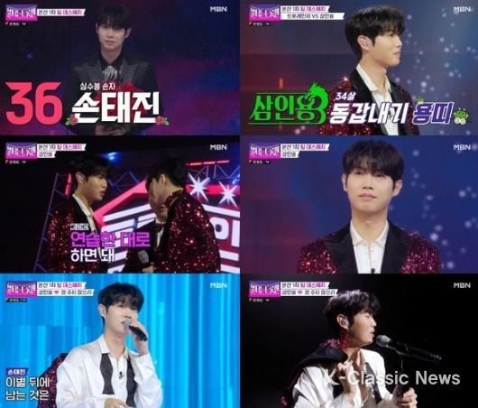 이어진 '팀 데스매치'에서는 1988년생 용띠인 오송, 황준과 '삼인용'을 결성한 손태진이 화려한 레드 스팽글 의상을 입고 등장해 눈길을 끌었다. 손태진은 정자세를 고수했던 예선 무대와 달리 "우리 삼인용한텐 안 돼요"라며 깜찍한 기선 제압을 해 반전 매력을 선사했다.
