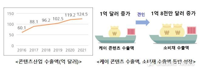 콘텐츠산업 수출액은 가전(86억 7천만 달러), 이차전지(86억 7천만 달러), 전기차(69억 9천만 달러), 디스플레이 패널(36억 달러) 등 주요 품목을 넘어 우리나라의 대표적인 수출 품목으로 자리 잡았다. 또한 한국수출입은행에 따르면 한국문화(케이) 콘텐츠 수출이 1억 달러 증가할 때, 화장품, 식품 등 소비재 수출도 1억 8천만 달러가 함께 증가하는 것으로 분석(’22년 발표)됐다. 앞으로도 콘텐츠 산업 수출은 상승세를 이어나갈 것으로 예측되며, 동시에 제조업, 서비스업의 동반 성장과 수출도 견인할 것으로 예상되어, 우리 수출을 이끌어갈 첨병으로서 역할이 기대된다.