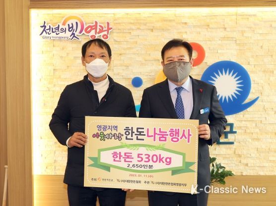 K-Classic News 김성연 기자 | 한돈협회 영광군지부는 지난 11일 “2023년 설맞이 한돈 나눔행사”를 통해 영광군에 돼지고기 265박스를 기탁했다.