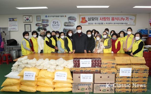 K-Classic News 김성연 기자 | 부산 중구 여성자원봉사원회는 16일 관내 결연(홀몸 어르신·장애인·한부모가정 등) 100세대에 설 명절을 맞아 선물세트(떡국·참기름·멸치)를 포장·전달하는 '설맞이 사랑의 명절음식 나누기' 행사를 개최해 따뜻한 마음을 전달했다.