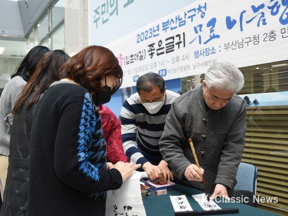 K-Classic News 김성연 기자 | 1월 31일 남구청이 주관하고 남구문화원 및 남구서예인회에서 주최하는 “입춘맞이 좋은 글귀 무료 나눔행사”를 부산 남구청 2층 민원실에서 개최했다.