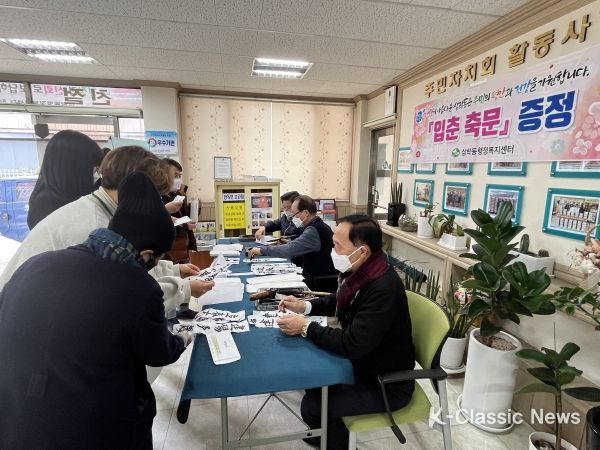 주민자치회 프로그램 서예교실의 원이복 강사와 수강생들의 재능기부로 동 행정복지센터를 방문한 민원인에게 ‘입춘대길(立春大吉), 만사형통(萬事亨通)’ 축문을 나누며 덕담을 주고 받았다.