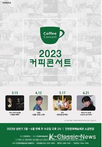 K-Classic News 박미영 기자 | 인천광역시는 2008년에 시작해 누적 관객 8만 6천 명을 돌파하며 인천의 대표 브랜드 공연으로 자리매김한 '커피콘서트'가 2023년 3월부터 6월까지 총 4회 차의 라인업을 공개한다고 밝혔다.