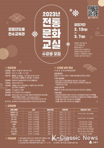 K-Classic News 박미영 기자 | 강릉시는 오는 13일부터 3월 7일까지 2023년도 강릉단오제전수교육관 전통문화교실 프로그램 수강생을 모집한다.