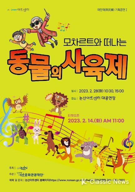 K-Classic News 최태문 기자 | 논산문화관광재단(대표이사 지진호)이 오는 28일 오전 10시 30분과 오후 3시에 어린이를 위한 클래식 콘서트 ‘모차르트와 떠나는 동물의 사육제’공연을 연다.