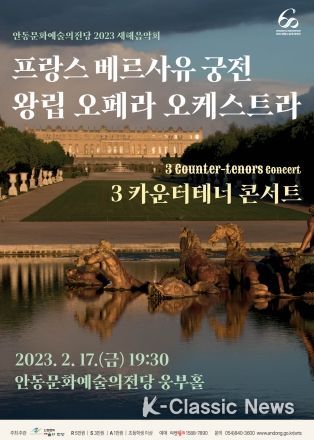 K-Classic News 최지은 기자 | 안동문화예술의전당은 오는 17일 저녁 7시 30분 웅부홀에서 국제적인 명성의 아티스트와 프랑스를 대표하는 오케스트라가 함께하는 ‘2023년 새해음악회 – 프랑스 베르사유 궁전 왕립 오페라 오케스트라 & 3카운터 테너 콘서트’를 진행한다.