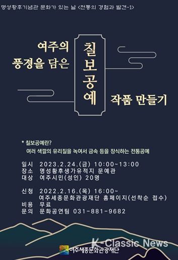 K-Classic News 최지은 기자 | 여주세종문화관광재단은 오는 24일, 명성황후기념관 2월 문화가 있는 날 프로그램으로‘여주의 풍경을 담은 칠보공예 작품 만들기’를 진행한다.