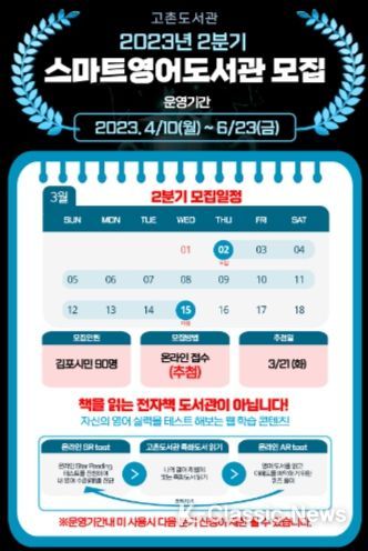 K-Classic News 최지은 기자 | 김포시립 고촌도서관은 4월 10일부터 6월 23일까지 ‘2023년 2분기 스마트영어도서관’을 운영한다.