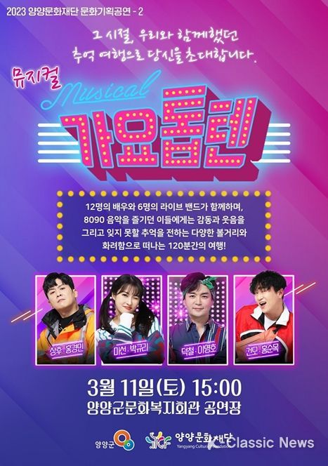 K-Classic News 김성연 기자 | 양양군 · (재)양양문화재단이 주최하는 “2023 문화기획공연·2 '뮤지컬 가요톱텐'” 공연을 오는 3월 11일 오후 3시, 양양군 문화복지회관 공연장에서 연다.