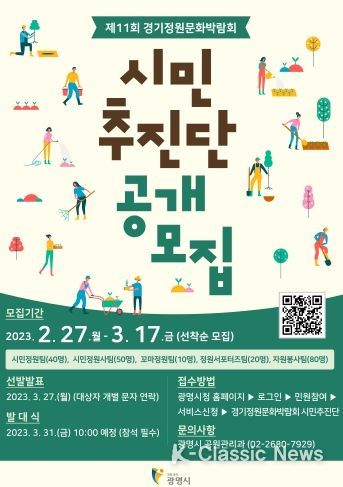 K-Classic News 최태문 기자 | 광명시는 오는 10월 개최하는 ‘제11회 경기정원문화박람회’를 앞두고 시민이 직접 참여하여 광명시만의 생동감 있는 정원을 만들기 위해 27일부터 ‘경기정원문화박람회 시민추진단’을 모집한다고 밝혔다.