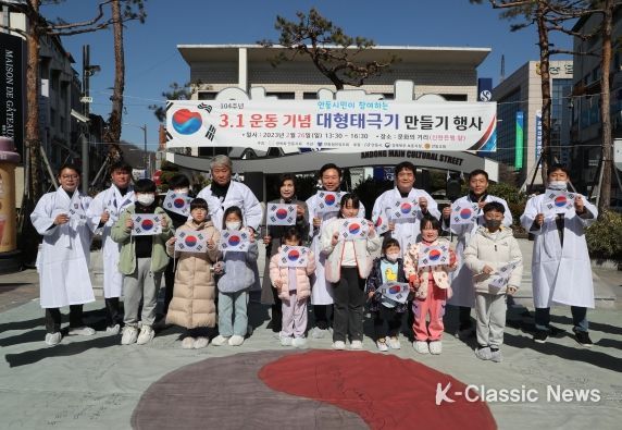 K-Classic News 김성연 기자 | 3.1절 기념 만세재현행사를 앞둔 26일 안동 문화의 거리에서 대형 태극기 만들기 행사가 열렸다.