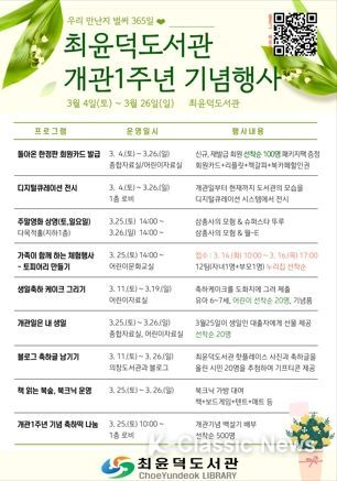 개관 1주년 당일에는 가족체험행사(사전접수:3월 14일 오전 10시, 최윤덕도서관 누리집), 축하떡 나눔 행사, 영화상영을 진행하며, 3월 25일, 26일 이틀간은 개관일은 내생일, 북크닉 행사를 운영한다.