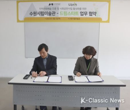 K-Classic News 최지은 기자 | 경기도 수원시립미술관은 취약계층 아동에게 맞춤형 통합 서비스를 제공하는 사업인 수원시 드림스타트와 지역문화예술 진흥 및 사회공헌사업 활성화를 위한 업무협약을 2일(목) 체결했다.