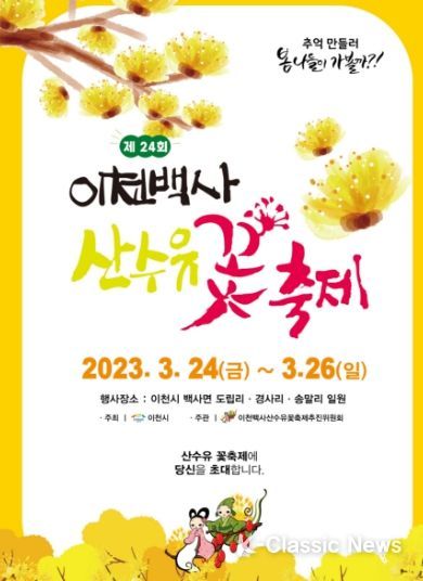 K-Classic News 최지은 기자 | 코로나19로 3년간 중단됐던 이천백사산수유꽃축제가 올해로 24번째 생일을 맞이하며 3.24(금)~3.26(일) 3일간 개최된다. 올해에는 산수유꽃이 예년에 비해 조금 일찍 꽃망울을 터뜨려 이를 예측한 이천시와 추진위원회에서는 지난해 만개시점을 기준으로 축제기간을 한주 앞당겨 3.24.(금)~3.26.(일) 3일간 개최한다고 밝혔다.