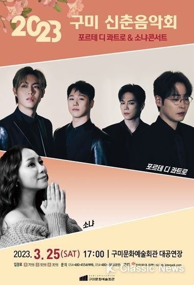 K-Classic News 이호민 기자 | 구미시가 따뜻한 봄을 맞아 구미문화예술회관 대공연장에서 오는 3월 25일(토) 오후 5시에“2023 구미 신춘음악회 '포르테 디 콰트로 · 소냐 콘서트'”를 개최한다.