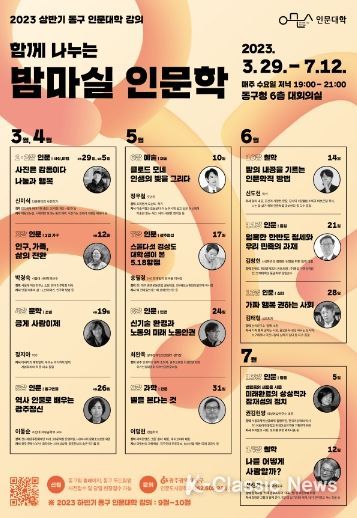 K-Classic News 최지은 기자 | 광주 동구는 ‘함께 나누는 밤마실 인문학’을 주제로 다수의 명망 있는 강사들을 모시고 올해 상반기 동구 인문대학을 개강한다고 밝혔다.
