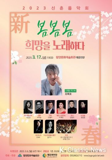 K-Classic News 최지은 기자 | 함양군은 오는 17일 오후 7시 문화예술회관 대공연장에서 ‘봄,봄,봄 희망을 노래하다’라는 주제로 신춘음악회를 개최한다.