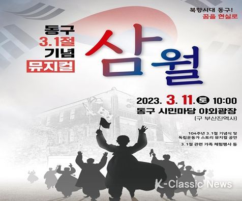 K-Classic News 최지은 기자 | 부산 동구는 부산동구문화원과 함께 3월11일 오전10시 동구 시민마당 야외광장(구. 부산진역사 광장)에서 동구 3.1절 기념 재현행사로 뮤지컬'삼월'을 공연할 예정이다.
