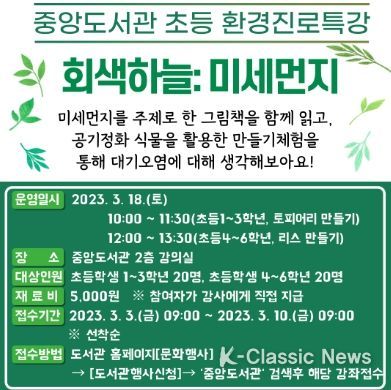 K-Classic News 최지은 기자 | 안성시 중앙도서관에서는'회색하늘: 미세먼지'진로독서프로그램을 3월 18일 토요일 오전 10시와 12시에 중앙도서관 2층 강좌실에서 진행한다.