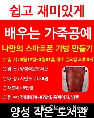 K-Classic News 최지은 기자 | 안성시 양성작은도서관에서는 양성 주민들을 위한 취미 체험 및 자기 계발 프로그램으로 쉽고 재미있게 배우는 가죽 공예 '나만의 스마트폰 가방 만들기'를 운영한다. 본 프로그램은 3월 17일부터 3월 31일까지 매주 금요일 오후 2시에 양성작은도서관 내에서 진행될 예정이다.