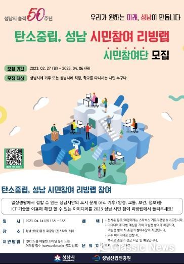 K-Classic News 최지은 기자 | 성남시와 성남산업진흥원은 오는 4월 14일 탄소중립 성남 시민참여 리빙랩 개최를 위해 리빙랩에 참여할 시민을 모집 중이라고 밝혔다.