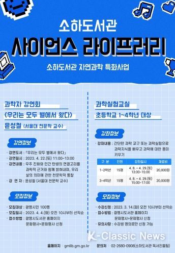 K-Classic News 최지은 기자 | 광명시 소하도서관은 자연과학 특화 프로그램 '사이어스 라이프러리'의 하나로 ‘과학실험교실’과 ‘과학자 강연회’를 진행한다.