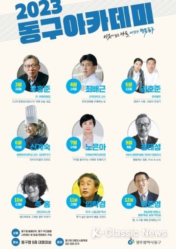 현장 강연 참여는 지난달 28일부터 동구청 누리집이나 모바일 앱 ‘두드림’, 전화로 선착순 접수 중이며 강연 시작 전 15분간 사전공연도 준비되어 있다.