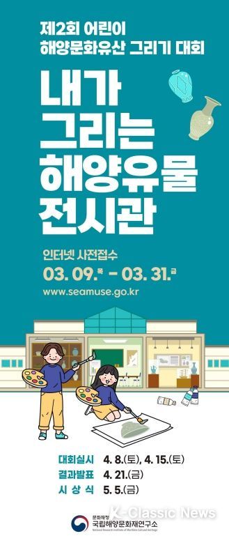 K-Classic News 최태문 기자 | 문화재청 국립해양문화재연구소(소장 김성배)는 오는 4월 8일과 15일 오후 1시부터 5시까지 목포해양유물전시관(이하 전시관)에서 우리 바다의 역사와 해양문화유산의 중요성을 알리기 위해 전국의 유치원생과 초등학생을 대상으로 '제2회 어린이 해양문화유산 그리기 대회'를 개최한다.