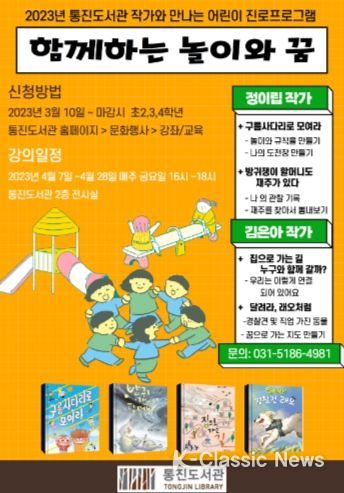 K-Classic News 최지은 기자 | 김포시립 통진도서관은 초등학교 2~4학년을 대상으로 4월 7일부터 28일까지 매주 금요일 오후 4~6시 어린이 진로 프로그램 ‘함께하는 놀이와 꿈’을 운영한다.
