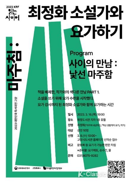 K-Classic News 최태문 기자 | 고양특례시가 2023 대한민국 독서대전을 유치해 다양한 책의 도시 연중 프로그램을 펼치고 있는 가운데, 3월 16일(목) 저녁 7시 화정도서관 꽃뜰에서 ‘최정화 소설가와 요가하기’ 프로그램을 추진해 시선을 사로잡고 있다.