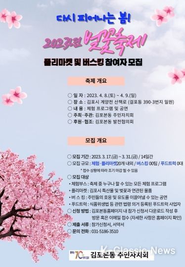 K-Classic News 최지은 기자 | 김포본동 주민자치회는 4월 8~9일 열리는 ‘2023년 벚꽃축제’와 관련, 플리마켓 및 버스킹 참가자를 모집한다.