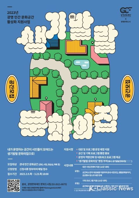 K-Classic News 최태문 기자 | 광명문화재단은 지역 내 문화예술 기반의 민간 운영 공간을 시민의 커뮤니티공간으로 활성화하고자 ‘2023년 광명 민간 문화공간 활성화 지원사업 '생기발랄문화의집'’에 참여할 민간 문화공간을 3월 9일부터 23일까지 모집한다.